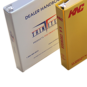 Custom printing on 3-ring binders, using either PMS color or CMYK ink.